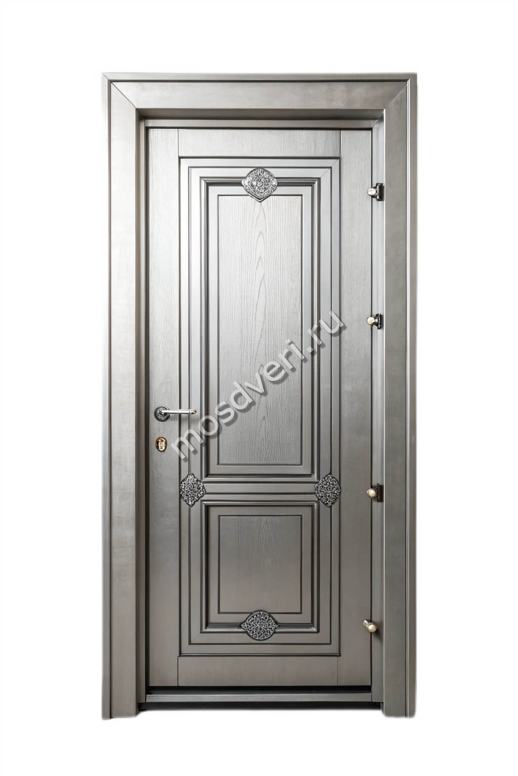 Красивая серебристая входная дверь в квартиру с шумоизоляцией КДД-002 — совмещает современный дизайн и высокую надёжность.